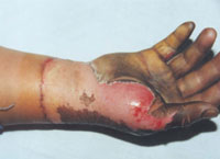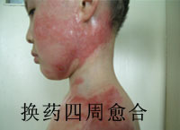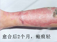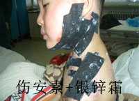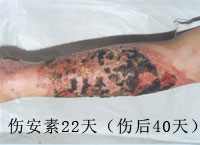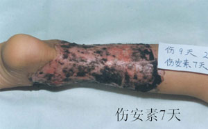 两组比较 * P〈0.05 七、瘢痕增生轻 1、3、6个月,随访17例(深Ⅱ 度12例,残余创面5例) 瘢痕色泽淡,充血不重,增生不明显。 应用伤安素的体会 1、质地细腻、柔软 ◆易贴敷创面 ◆病人感觉舒适 ◆操作简便 2、吸附能力强 ◆吸收渗液多 ◆保持创面干净 ◆肉芽水肿易消肿,创面新鲜 ◆残余小创面贴附牢固,大大减少换药次数 3、抗炎作用 ◆用于感染创面、促进炎症消退,减轻细菌感染 4、贴敷创面紧,不易脱落 优点:保护创面、减少换药 缺点:更换难揭 对策: ◆浅Ⅱ度贴敷良好,不予更换 ◆渗出多每日更换,避免形成硬痂壳 ◆局部分泌物,“开窗”换药 ◆内衬一层纱布利于浸湿揭除 ◆基底愈合时,外涂银锌霜,裹塑料薄膜24h